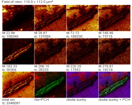Identification and localization of biomolecules in cells and tissue samples are important for understanding of subcellular structures. Isolated cardiac cells and tissue of rats are studied by using secondary ion mass spectrometry, providing chemical composition of cardiac cell membrane and tissue surface in native form. The result is a spatially resolved chemical imaging as a lateral distribution of biologically relevant molecules—phospholipids, along with fatty acids, and cholesterol. Phospholipids are represented by phosphatidylcholine and cardiolipin molecules and their fragments. Phosphatidylcholine polar head group at mass of 184.1 u has an origin in the cell membrane, and a two-dimensional distribution of this fragment provides clear chemical contours of the cell. The high-resolution contrast of the cell is observed within its environment represented with Na+ ions. Images of PO4H- fragment and fatty acids with 16 or 18 C atoms are determined in cardiac tissue. Distributions of these 16 and 18 C fatty acids are the same within their groups, and interestingly, these two distribution groups are spatially complementary. Contours of phosphatidylcholine and cardiolipin fragments are also complementary, the distributions of 16 C fatty acids and phosphatidylcholine are identical, and the distributions of 18 C fatty acids and cardiolipin are also the same. The secondary ion mass spectrometry is the excellent tool also for idetification of trace elements, like Si and Al, or Sr as part of the supplement, being helpful in medical and pharmaceutical research.